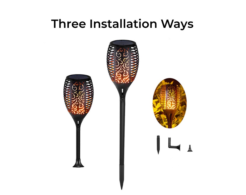 Voici trois méthodes d'installation de ces lampes solaires à flamme : installation enfichable, montage mural, installation sur piédestal.