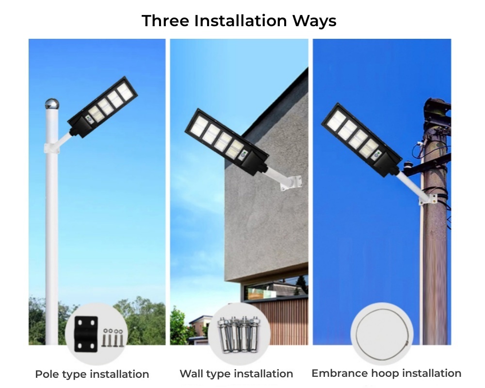 Pour une installation pratique, ce lampadaire solaire LED offre trois options de montage polyvalentes. La première option est l'installation sur poteau, dans laquelle les luminaires peuvent être facilement montés sur des poteaux existants ou sur des poteaux d'éclairage public dédiés. Cette méthode est idéale pour les applications d’éclairage public, garantissant un positionnement et une couverture optimaux.